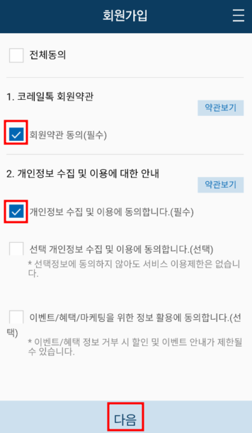 ▶4) 회원 약관의 필수 항목에만 동의를 하고 '다음'을 누릅니다.